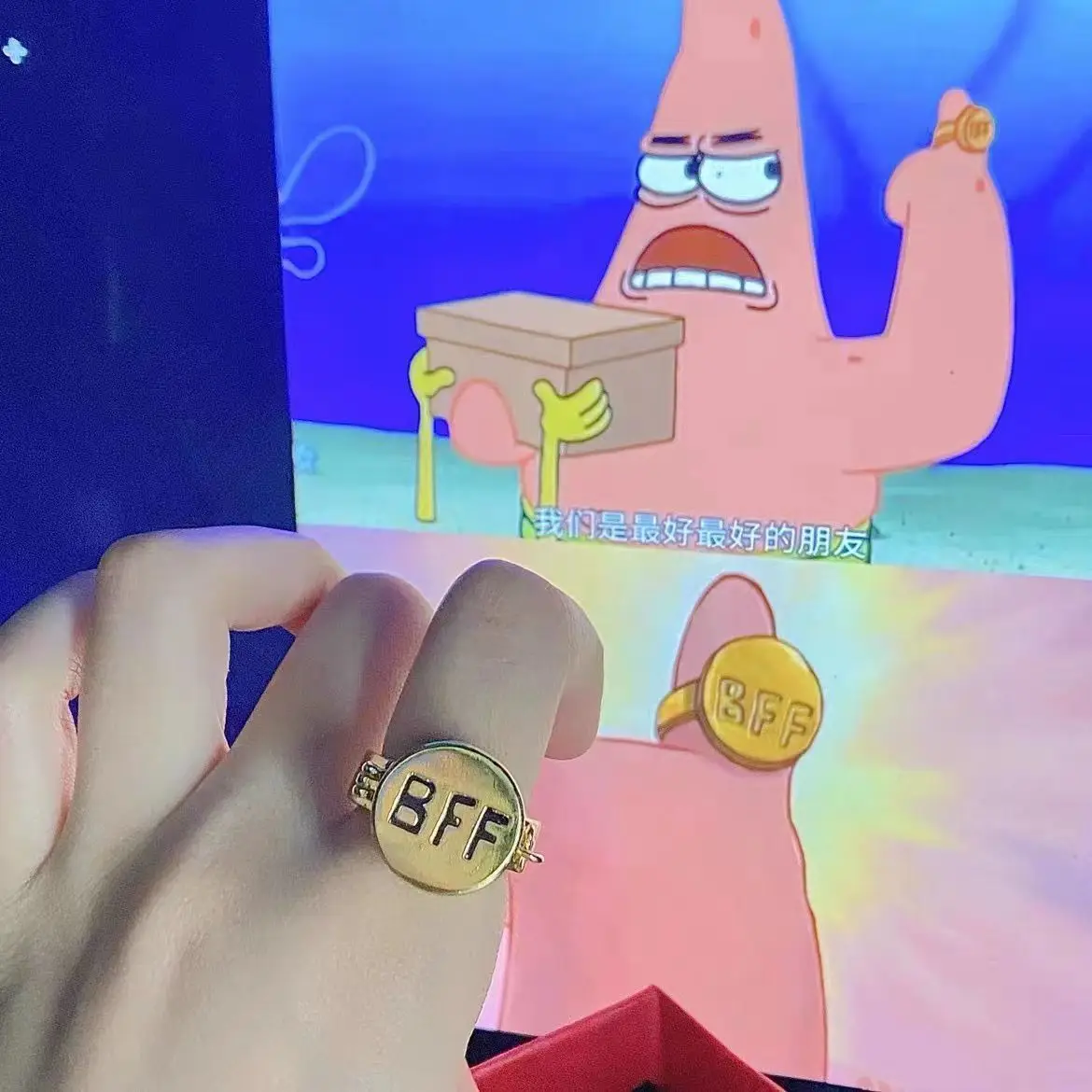 . Some of the bestselling spongebob best friends forever ring available on Etsy are: Spongebob,Patrick Star, amigurumi pattern; Peanut Butter and Jelly Keychain Set, Best Friends Easter Gift, Birthday Gift for kids; Personalized Bracelet for Women Gold Bar Bracelet Custom Initial Bracelet Friendship Custom Bracelet Personalized Name Bracelet -T32-3.5 Our exclusive Best Friends Forever Ring is a fan-favorite piece that is an exact replica of the show! The BFF Ring is perfect for you and your friend to represent your close friendship like Sponge and Pat's.
